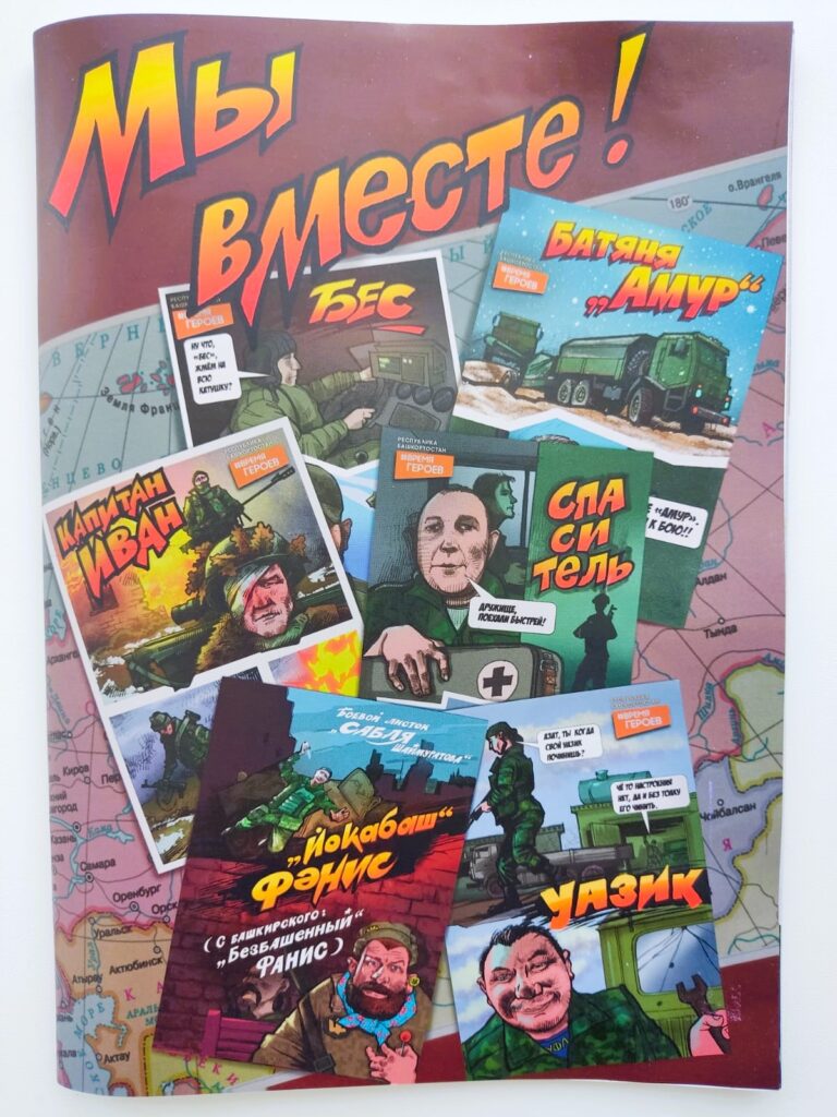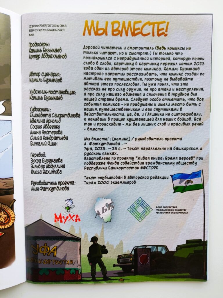 Изданная на грант Главы Республики Башкортостан патриотическая книга в картинках на башкирском и русском языках «Мы вместе! – Беҙ бергә!» повествует о двух друзьях-волонтерах, везущих гуманитарный груз бойцам СВО. Сюжет данного комикса не про силу оружия, не про атаки и наступления, а про силу нашего единения и сплочения в трудное для нашей страны время. Все события комикса – не придуманы и имели место быть с нашим путешественником и его спутниками в действительности.
