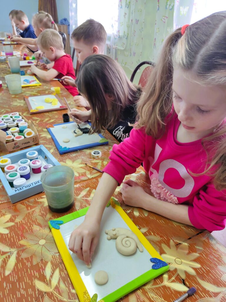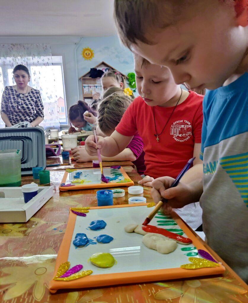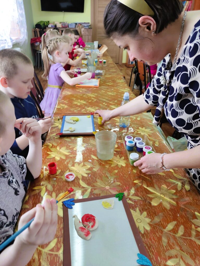 На одном из занятий дети изготовили панно из солёного теста, которое потом раскрасили красками!