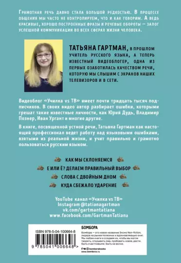 Грамотная речь давно стала большой редкостью. Кроме книги найти правильный русский язык просто негде. В процессе общения люди часто не утруждают себя правильным произношением. В своей книге, посвященной устной речи, Татьяна Гартман, известный видеоблогер (Училка vs ТВ), ведет работу над ошибками речи, взятыми из реальной жизни, и учит правильно и грамотно пользоваться русским языком.