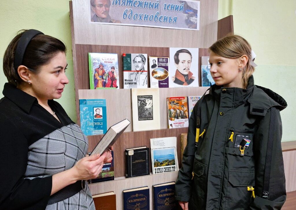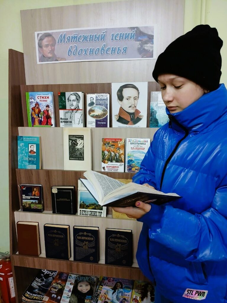 Библиотекарь, работающий на выставке, выполнял роль путеводителя по творчеству Михаила Юрьевича Лермонтова. Он помогал посетителям ориентироваться среди представленных книг и материалов, отвечал на вопросы и делился интересными фактами о жизни и творчестве поэта.