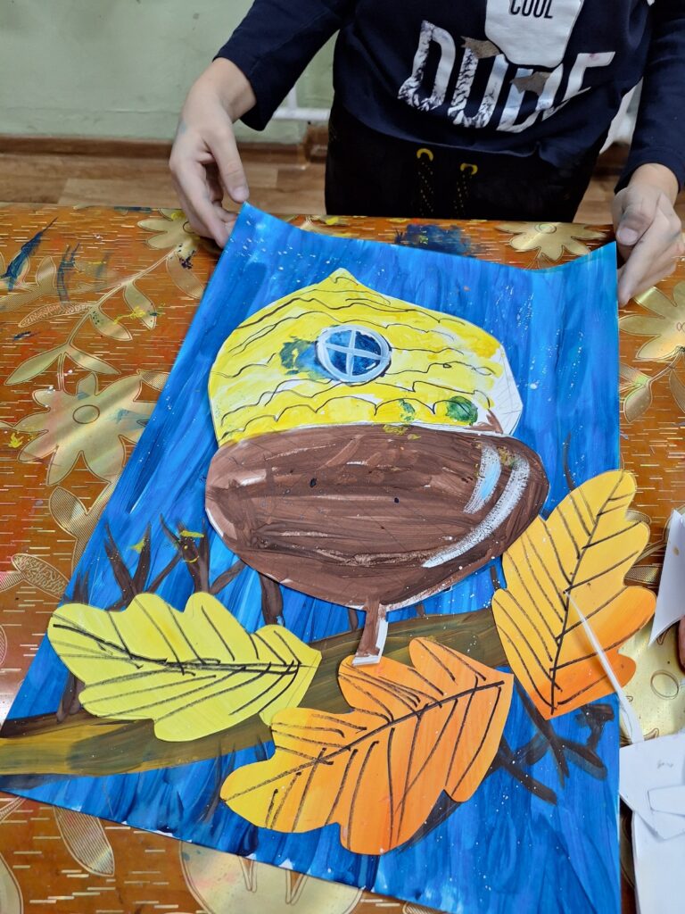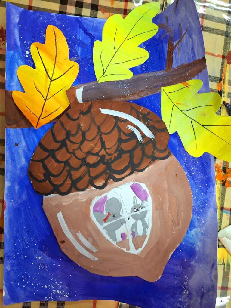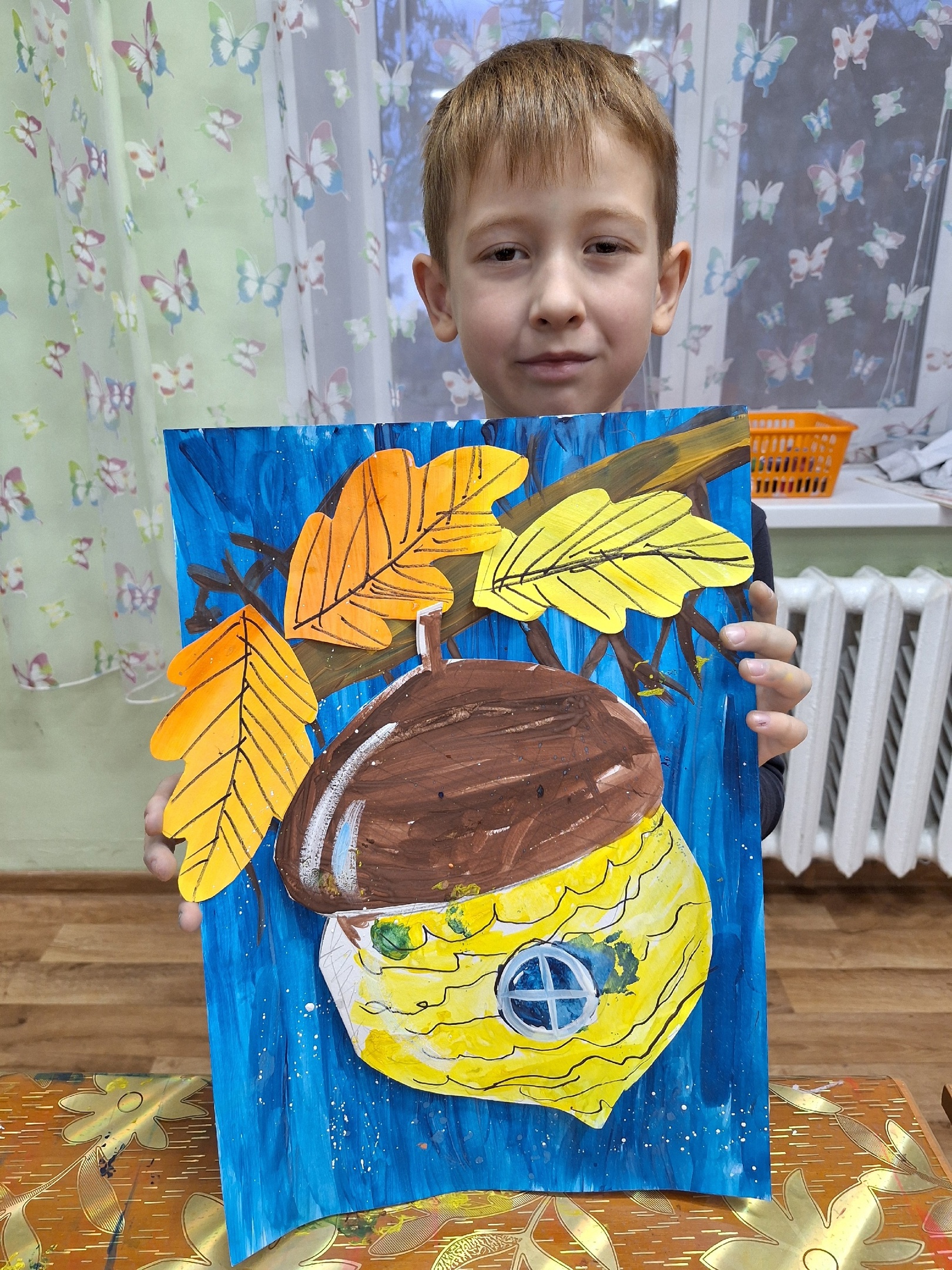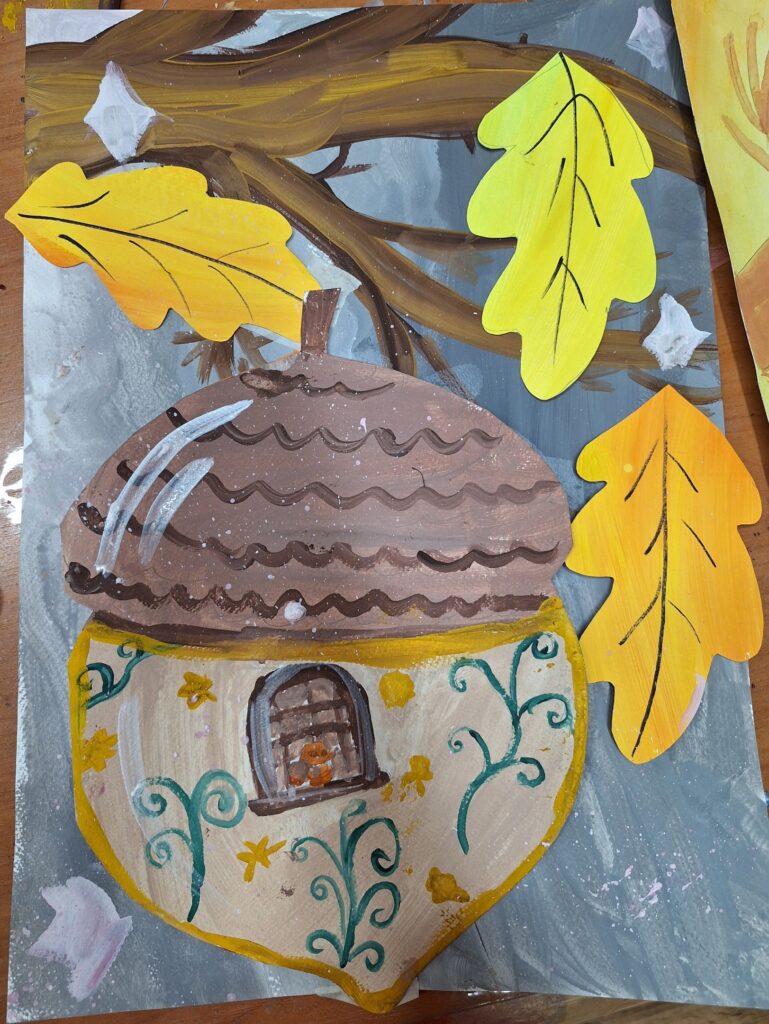 С ребятами выполнили творческую работу, где стояла задача «поселить» в домик-желудь своего персонажа.