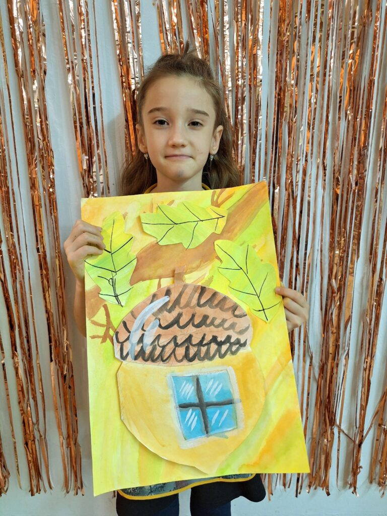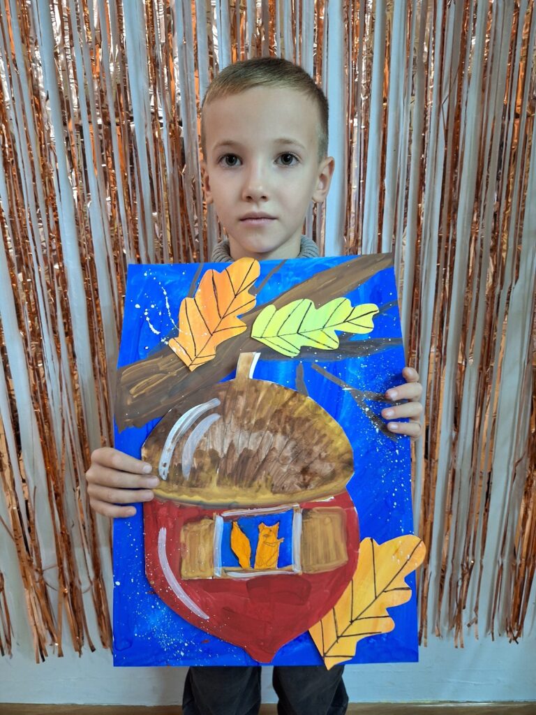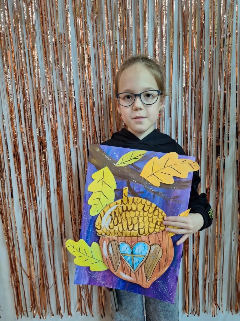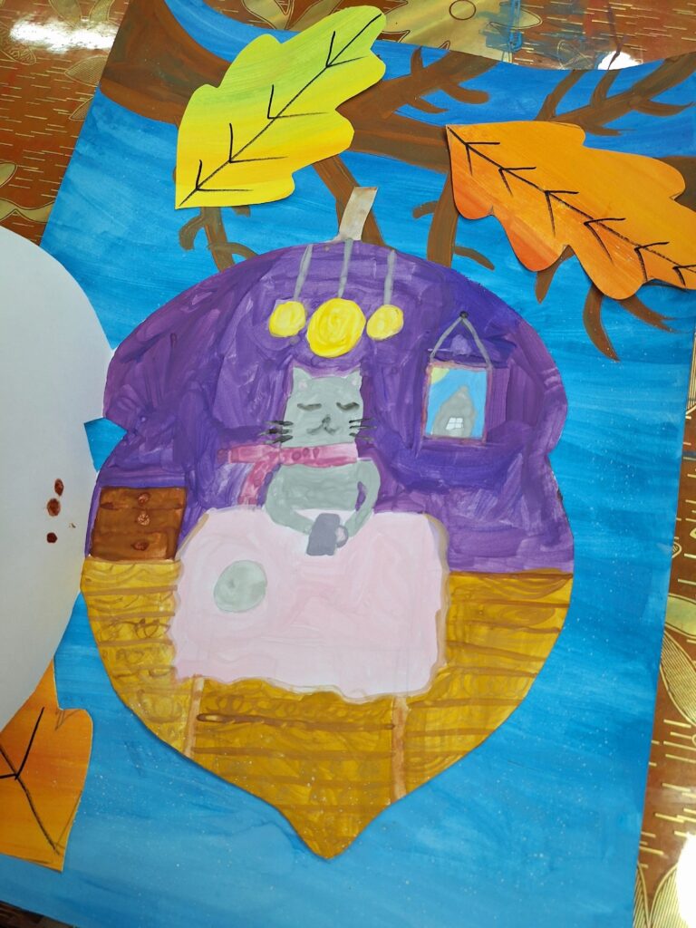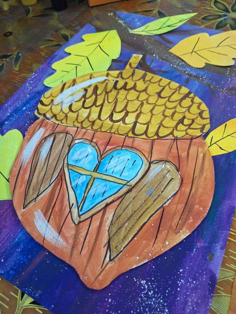 С ребятами выполнили творческую работу, где стояла задача «поселить» в домик-желудь своего персонажа.