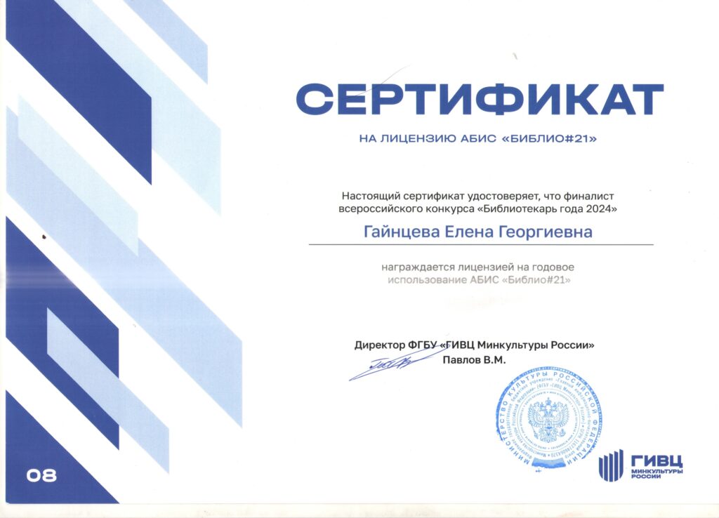 Елена Георгиевна не вошла в число победителей, но ее работа была оценена на высоком уровне. За свои профессиональные успехи она получила Сертификат финалиста и Сертификат на лицензию по использованию программного продукта АБИС «Библио#21», которые совсем недавно были получены участницей.