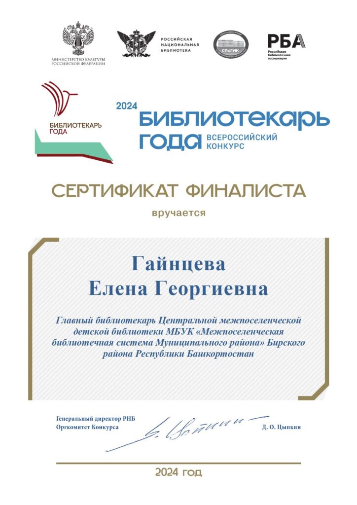 В 2024г. главный библиотекарь Детской библиотеки Гайнцева Елена Георгиевна приняла участие во Всероссийском конкурсе «Библиотекарь года». Она вошла в состав 22 финалистов, которые были отобраны из более чем 700 участников.