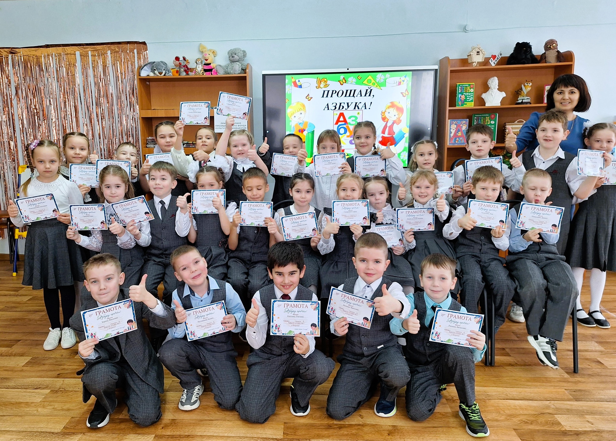 Сотрудники подготовили для них увлекательную программу. Праздник начался с приветственного слова ведущей, которая поздравила ребят с окончанием чтения первой книги – «Азбуки». Для ребят провели конкурсно — игровую программу, состоящую из различных эстафет, викторин и словесных игр. Завершилось мероприятие поздравлениями от учителя и вручением грамот о прочтении учебника.