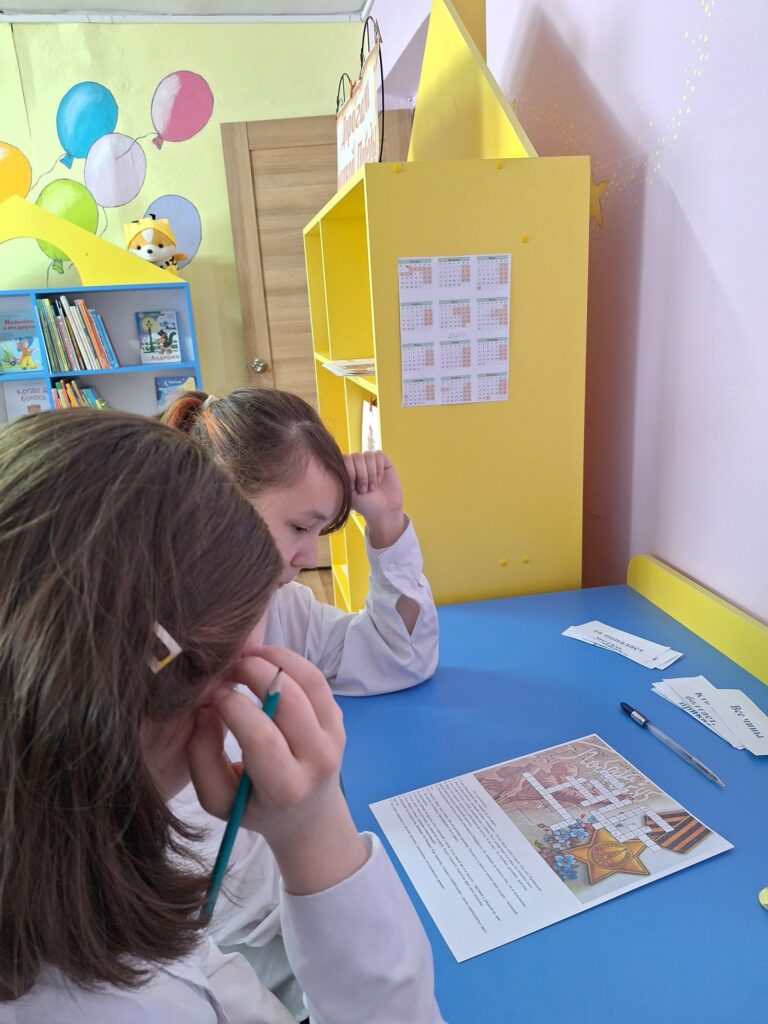 Также юные читатели смогли проверить свои знания, разгадав кроссворд на тему Дня Победы. Им предложили попробовать себя в роли художников, нарисовав танк и военный корабль по представленным образцам.