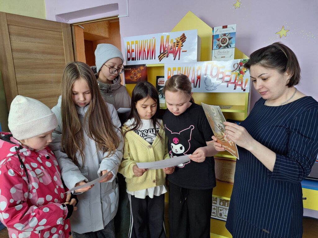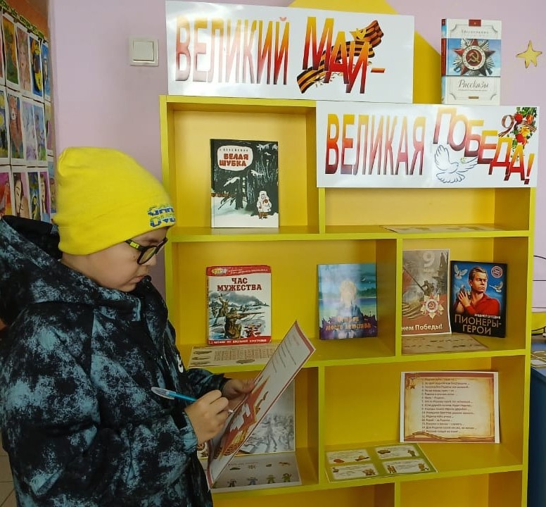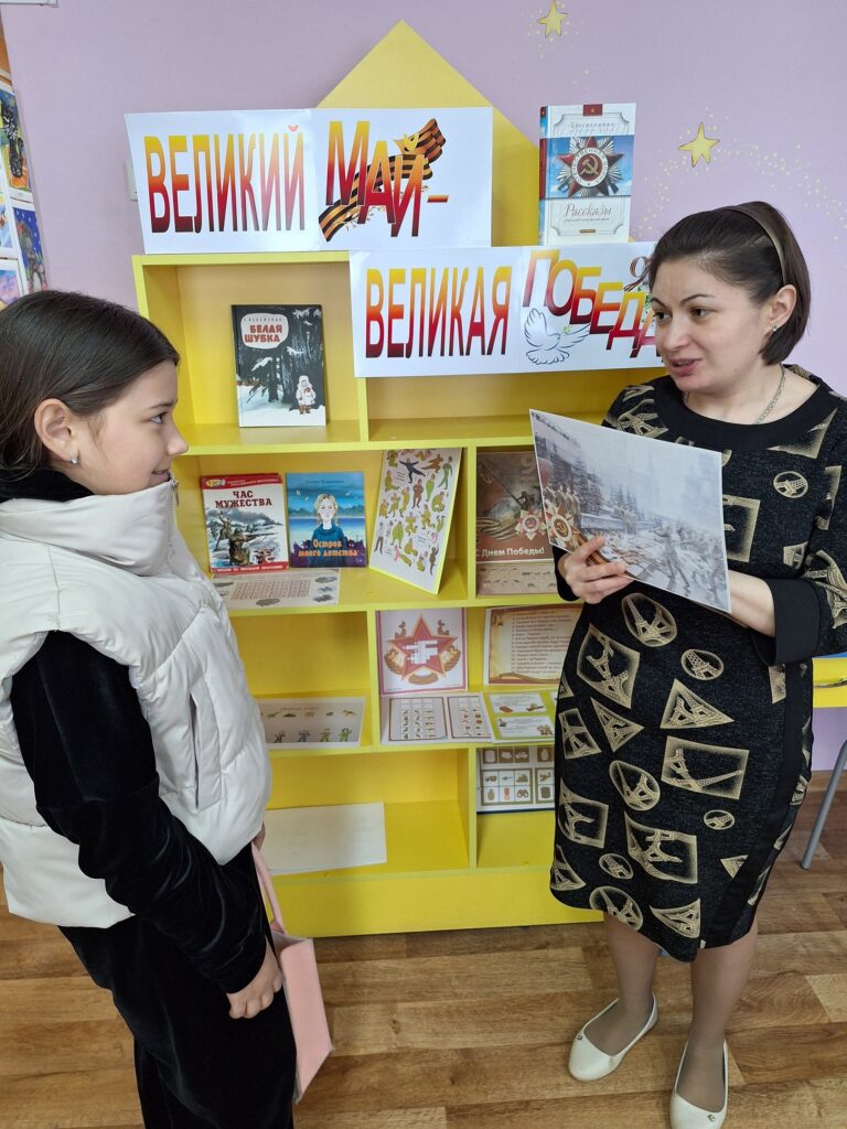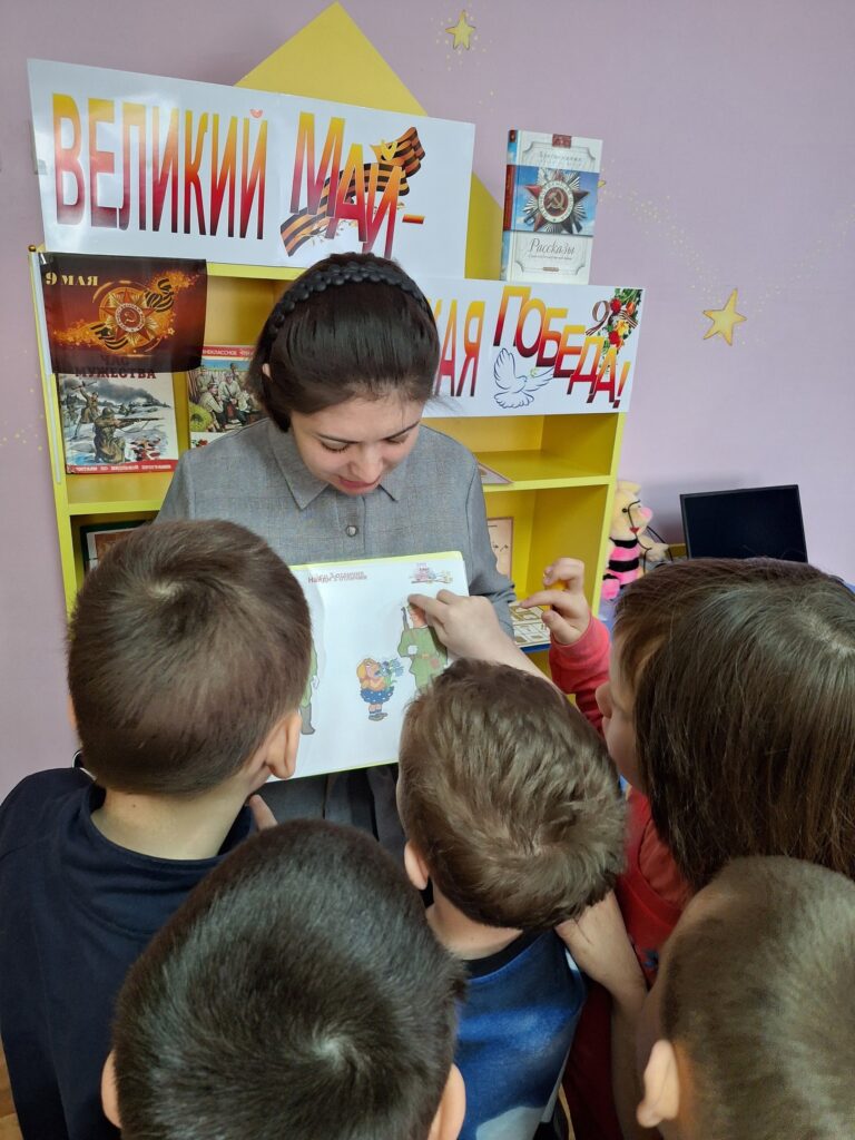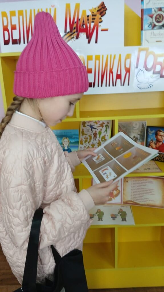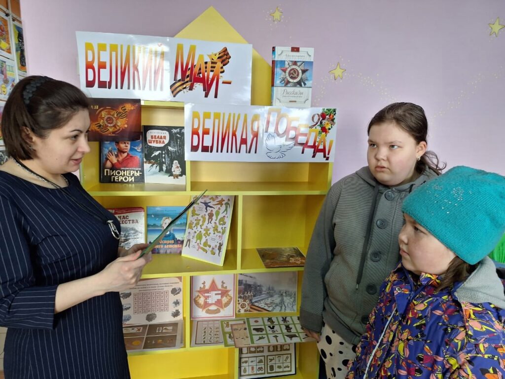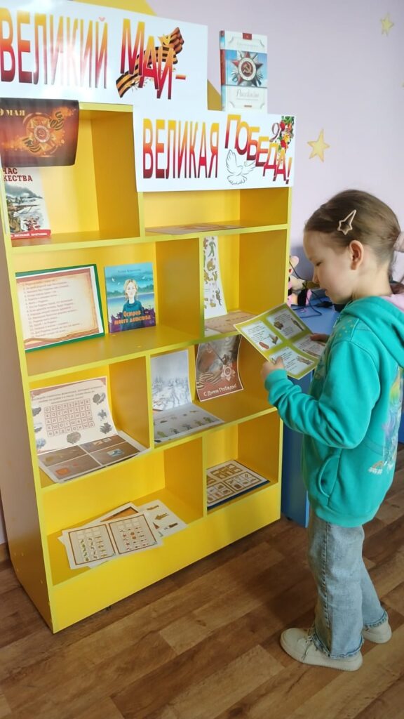 На младшем абонементе Детской библиотеки была оформлена интерактивная выставка «Великий май — великая Победа!», приуроченная ко Дню Победы. Здесь читатели смогли окунуться в атмосферу великой истории через книги, рассказывающие о событиях и героях Великой Отечественной войны.