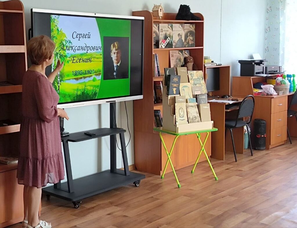 Для детей пришкольного лагеря МБОУ СОШ № 7 прошла беседа под названием «Поэтические тропинки Есенина». Ведущая, используя презентацию, рассказала ребятам о жизни и творчестве русского поэта. Затем дети внимательно послушали аудиозапись стихотворения «Берёза», после чего выполняли интерактивное задание — вставляли пропущенные слова в текст произведения, используя слайды презентации.