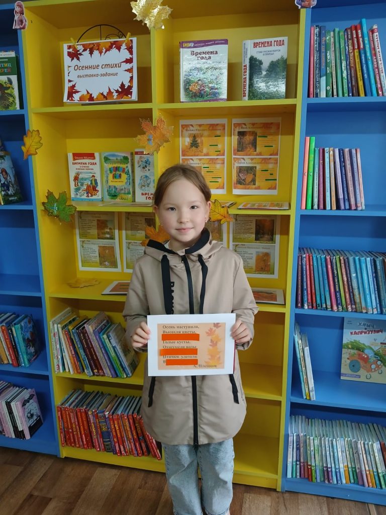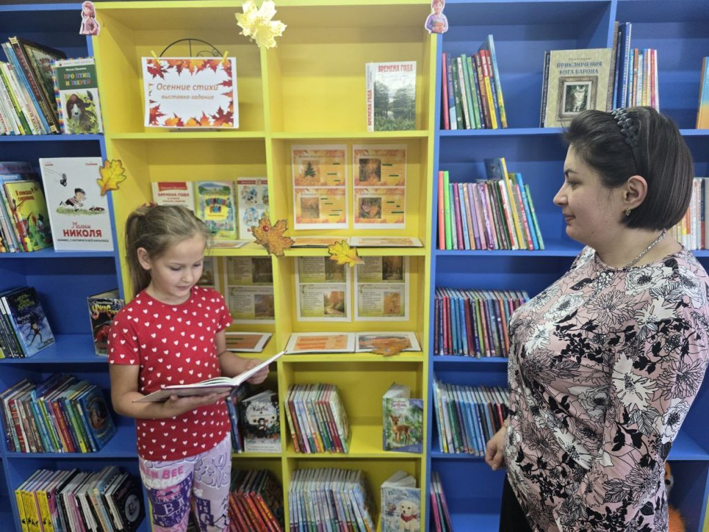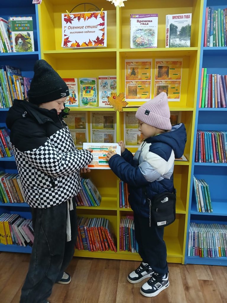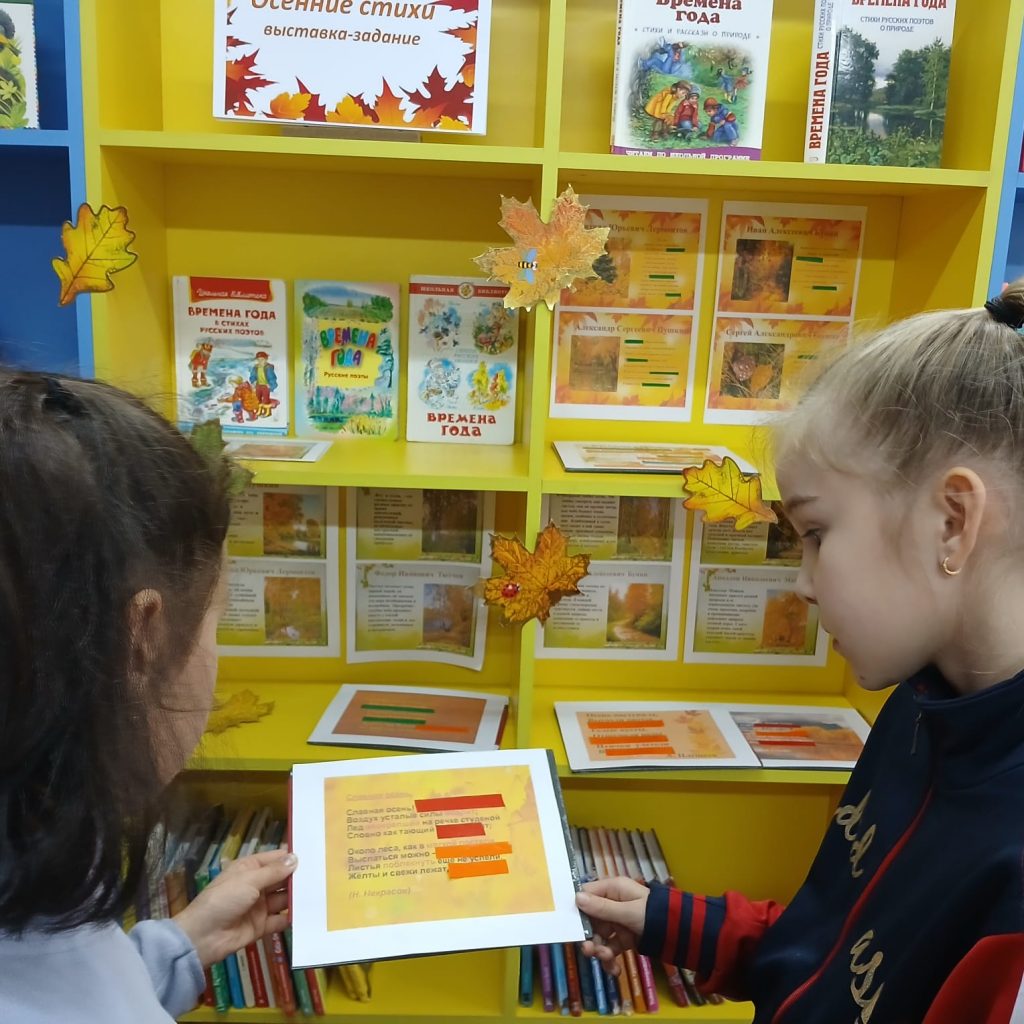 На младшем абонементе детской библиотеки была оформлена необычная выставка «Осенние стихи». Она представляла собой выставку-задание, на которой были представлены стихи известных русских поэтов об осени. Читателям было предложено вставлять пропущенные слова или даже целые строки, что позволило детям освежить память или познакомиться с новыми произведениями, посвящёнными золотой поре.