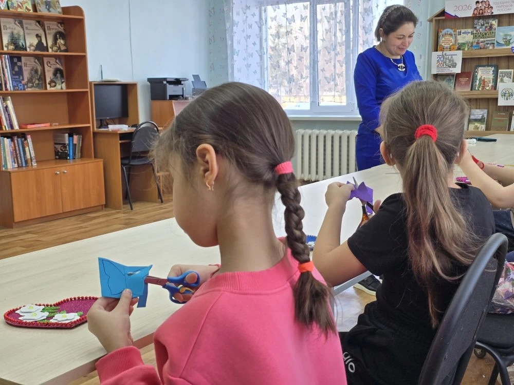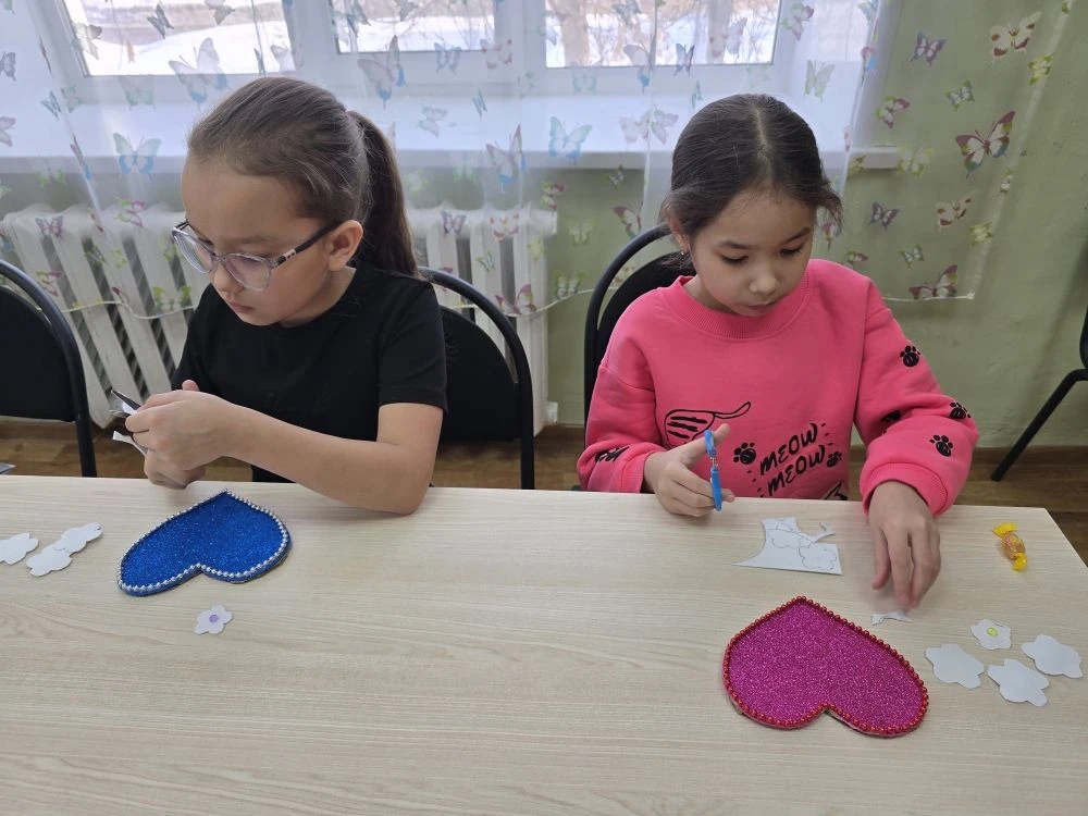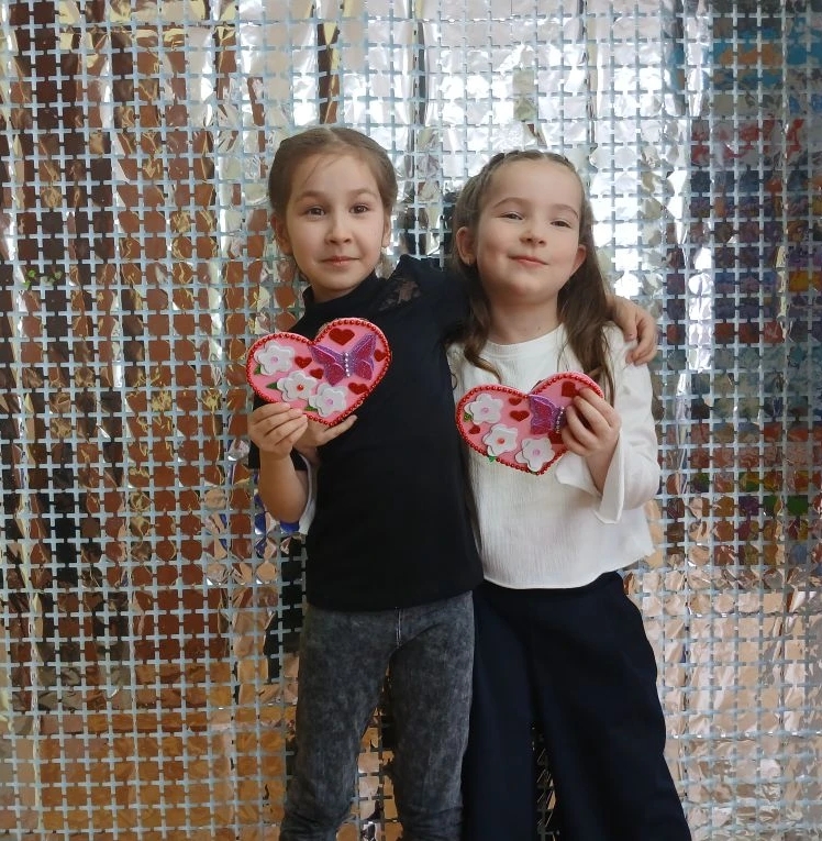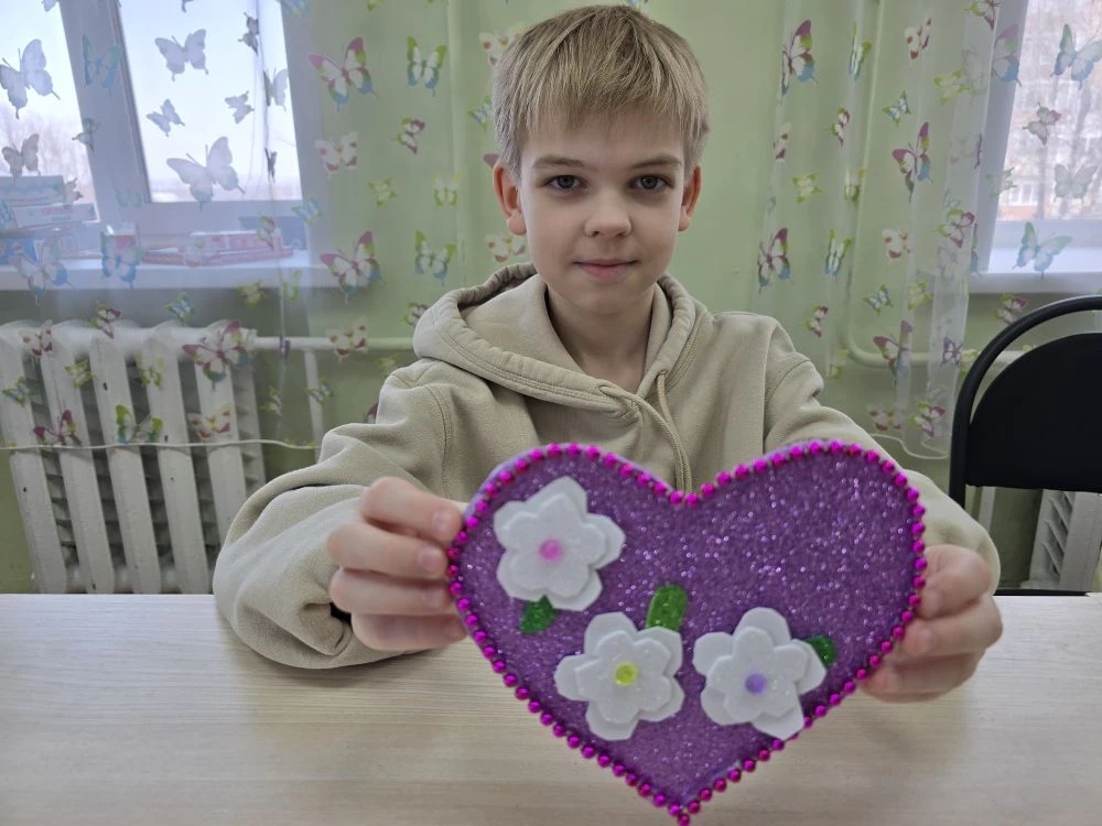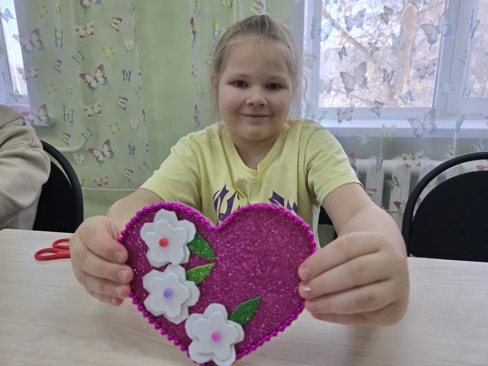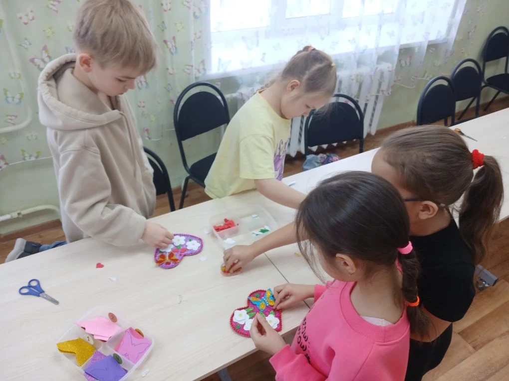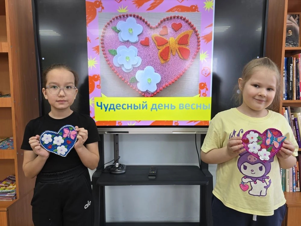 В Детской библиотеке прошел творческий час под названием «Чудесный день весны», на котором дети с удовольствием создали для любимых мам очаровательные сувениры- сердечки. Они были изготовлены из глиттерного фоамирана и блестящих бус. Ребята также добавили объемные белые цветы с мерцающими стразами в центре, а яркие бабочки и сердечки оживили композицию и наполнили её весенним настроением.