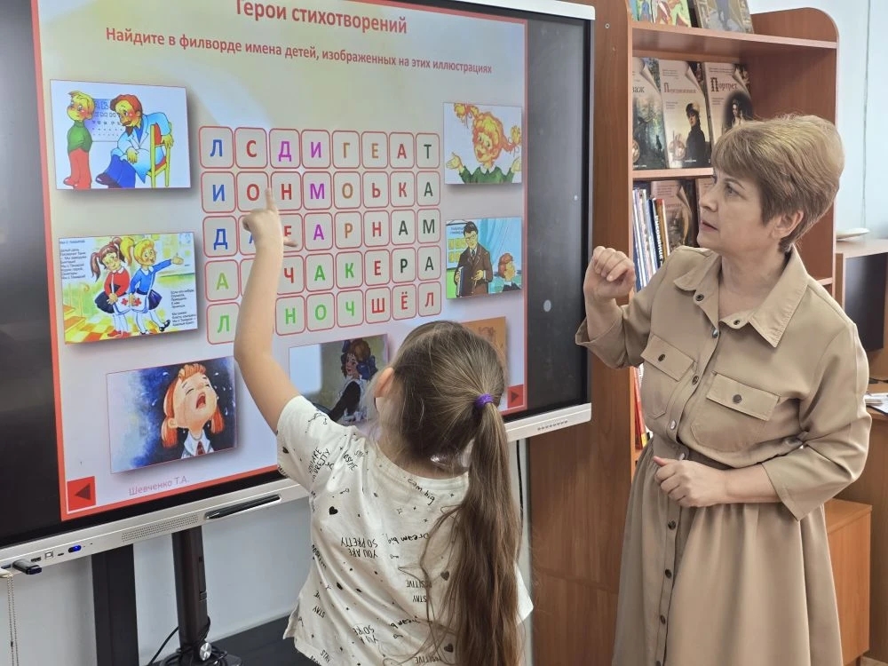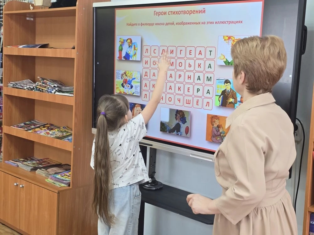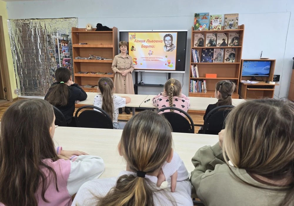 Первый день Недели детской книги в детской библиотеке посвятили творчеству Агнии Львовны Барто. Для юных читателей организовали литературно-игровую программу «Стихи Агнии Барто».Заведующая библиотекой Майя Андреевна Андреева с помощью презентации рассказала детям о жизни и творческом пути знаменитой поэтессы. В программу мероприятия вошли весёлые игровые задания: викторина по известным произведениям, филворд и игра, в которой нужно было угадать стихи по иллюстрациям.