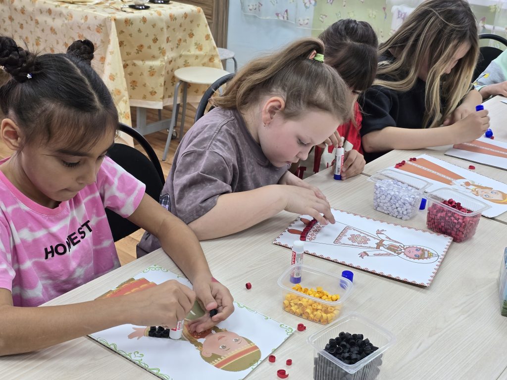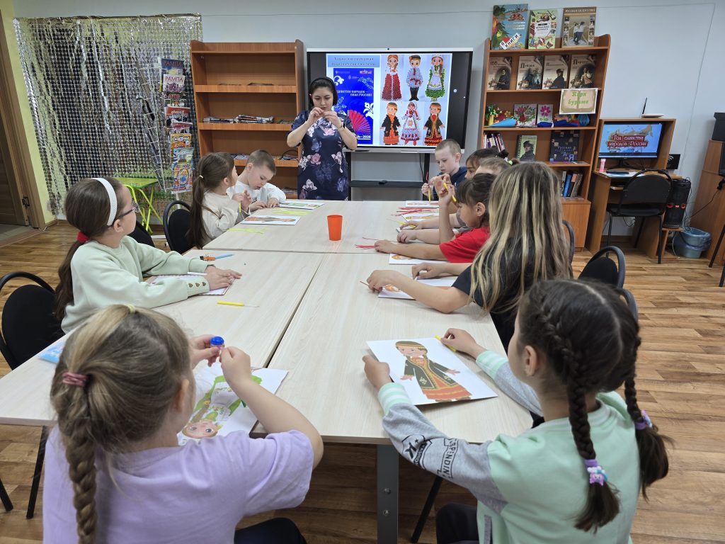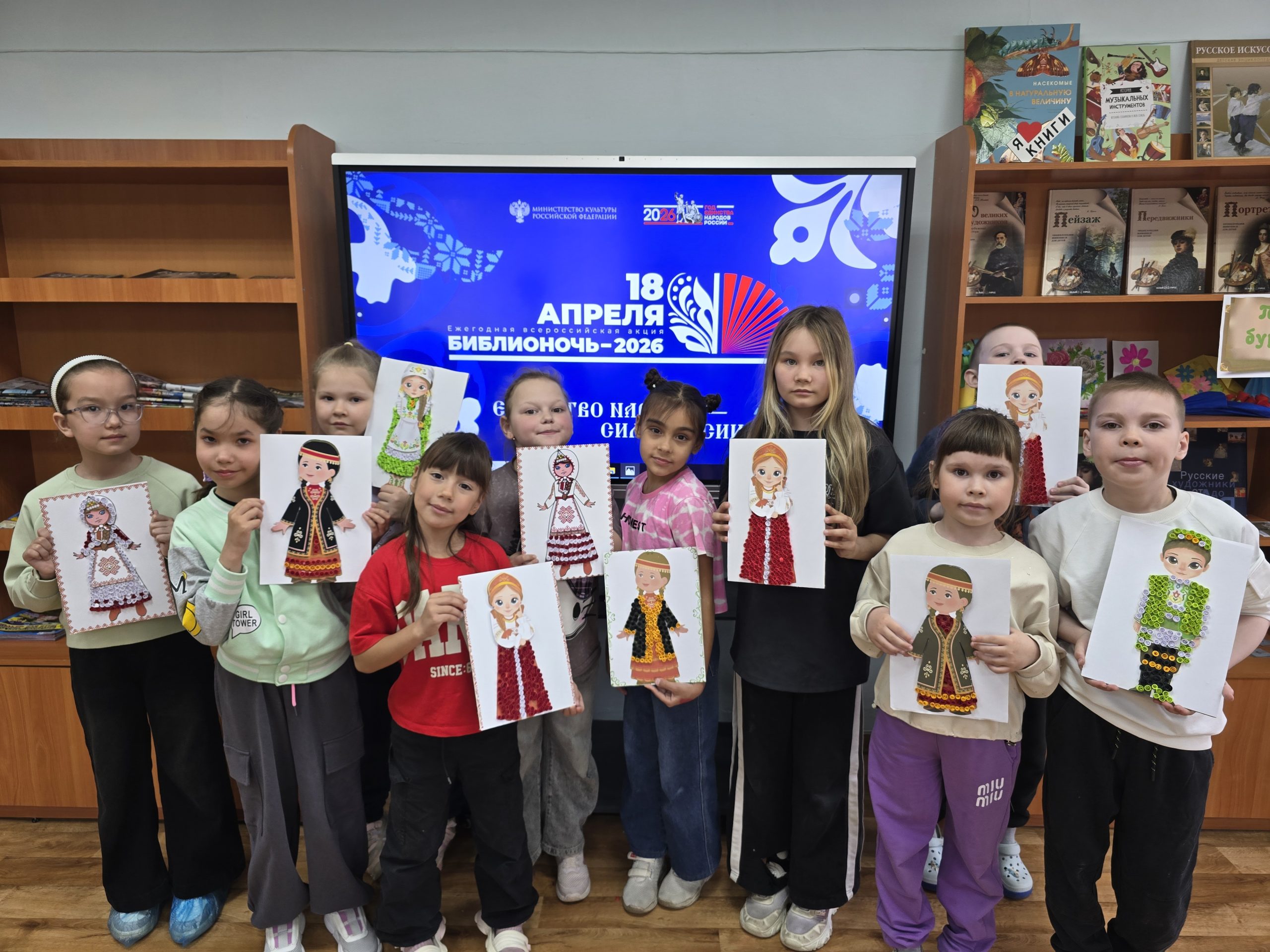 В творческой мастерской «Национальные костюмы» в рамках Библионочи ребята украшали бумажными узорами элементы костюмов девушек разных народов России: русских, татар, марийцев и башкир. Детям рассказали, чем отличаются костюмы этих народов и какие у них есть особенные украшения. Участники мастерской скручивали в технике квиллинг из цветной бумаги цветы, листья и узоры, а потом приклеивали их на шаблоны костюмов.